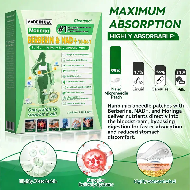 𝐂𝐥𝐞𝐚𝐫𝐞𝐧𝐚® Moringa· Berberine x NAD+ 10-in-1 Advanced Nano Microneedle Patch: 98% Absorption Rate, Transforming Weight, Liver, Gut & Skin Health